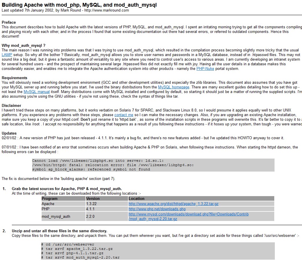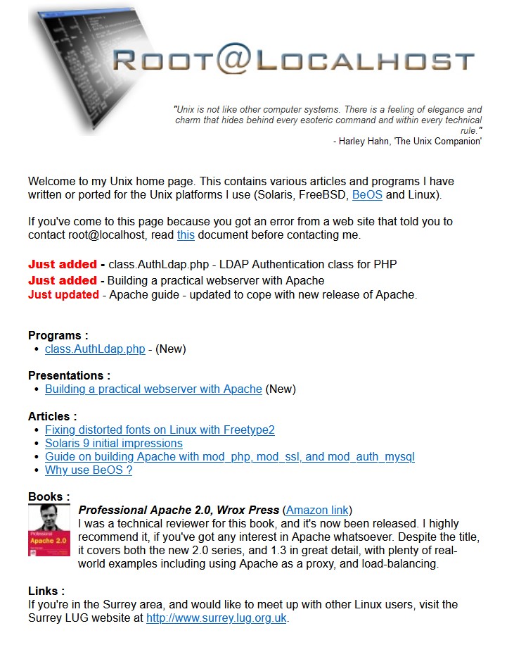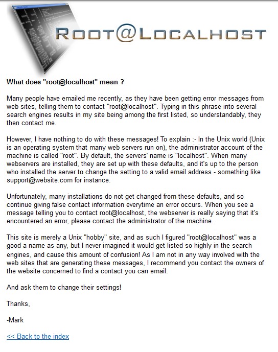 One hilarious side-effect of having a site that at the time ranked very highly when you searched for “root@localhost” was that I ended up getting a ton of emails from people I’d never heard of asking for help with random error messages. The default contact email address shown on error pages for the Apache webserver was root@localhost. Lots of sites back then didn’t bother to change the defaults, so when Joe Random saw a page-not-found error on a website, they saw contact root@localhost for support, would chuck that into Google and land on my page. I had to include a “really, I have nothing to do with this, and no I did not break your webserver” page to explain it all.