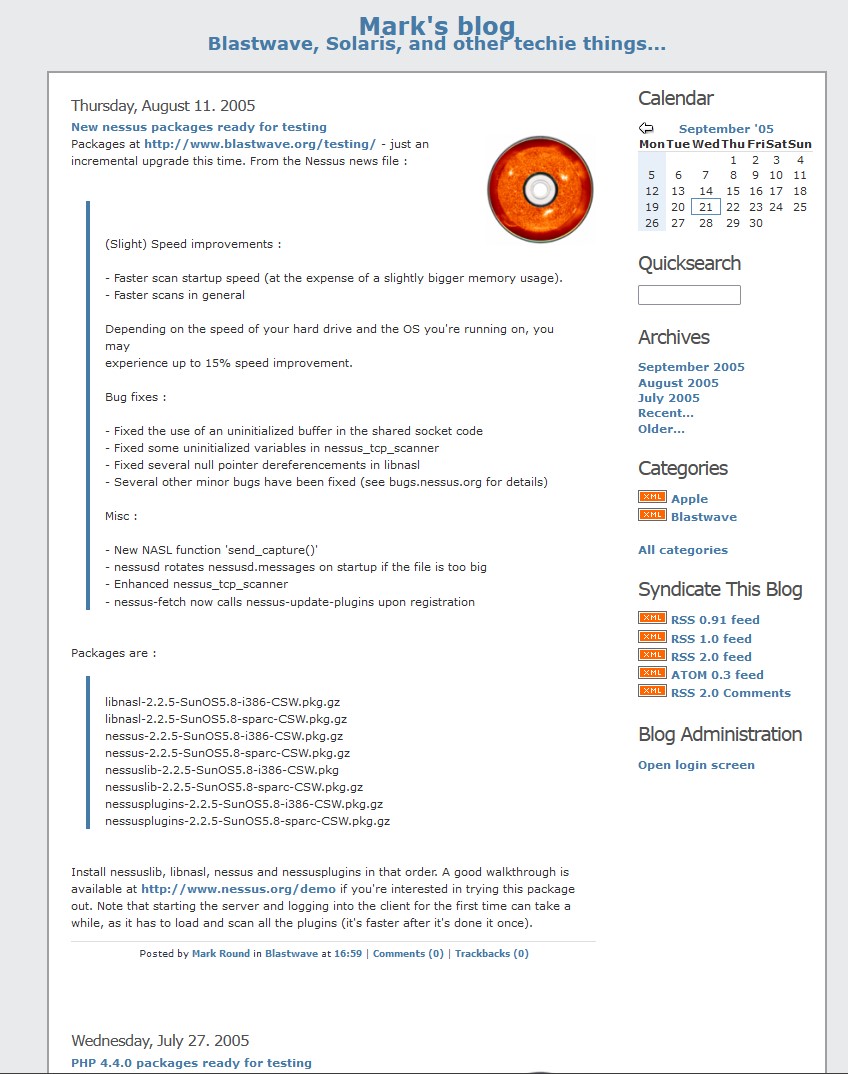 I also joined the now-defunct Blastwave.org project around 2003. This was a community effort that built packages for Solaris systems similar to e.g. a Debian APT repository. That was a big deal back then as the ancient SysV packaging system on Solaris was horrible, with no dependency resolution or proper integration with Sun’s patching system. We were pretty much the “go-to” site for Solaris open-source software at the time. My blog covered updates on the packages I maintained: PHP, PostgreSQL, Nessus and a few others. Sadly, internal politics and Major Internet Drama™ led me to drop out in 2008. A lot of the maintainers (hey guys!) did move over to the new OpenCSW project though, which still seems to be kinda going. But by that point the writing was on the wall for Solaris, and I’d moved on to pretty much 100% Linux and BSD by then.