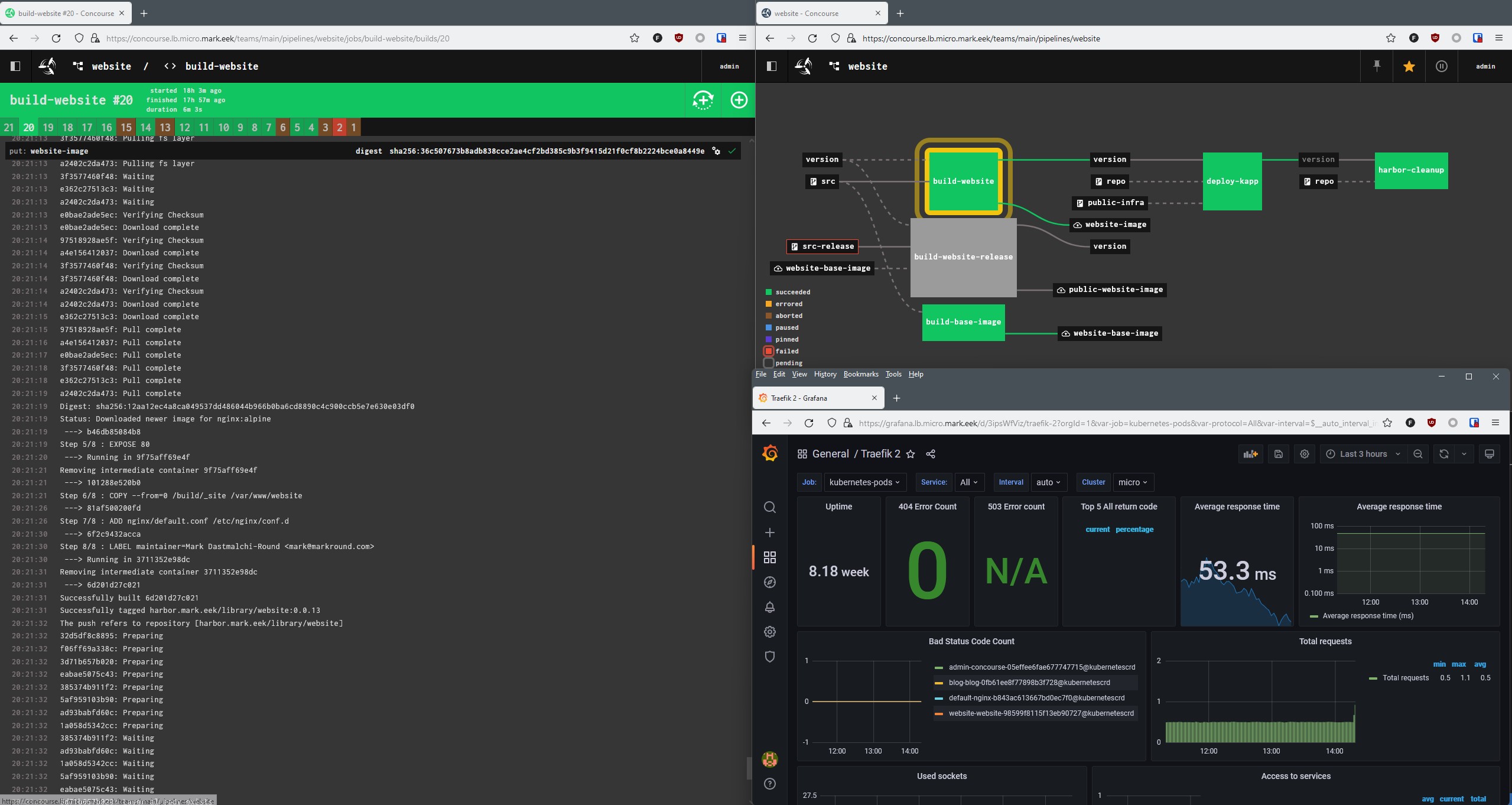 This site is now managed and deployed in the same kind of way I now teach my customers: The website and infrastructure is all expressed as code and generally runs through Drone CI pipelines that run Terraform tasks, deploy containers using Helm, FluxCD and so on. It’s all hooked up to a CI/CD set of pipelines that build the containers that make up this site, so all I have to do to publish a post now is make a git commit, or push a branch to production. Everything is running on a cloud-hosted Kubernetes cluster with the currently “trendy” stack of ELK/Prometheus/Grafana/Traefik/NginX etc.