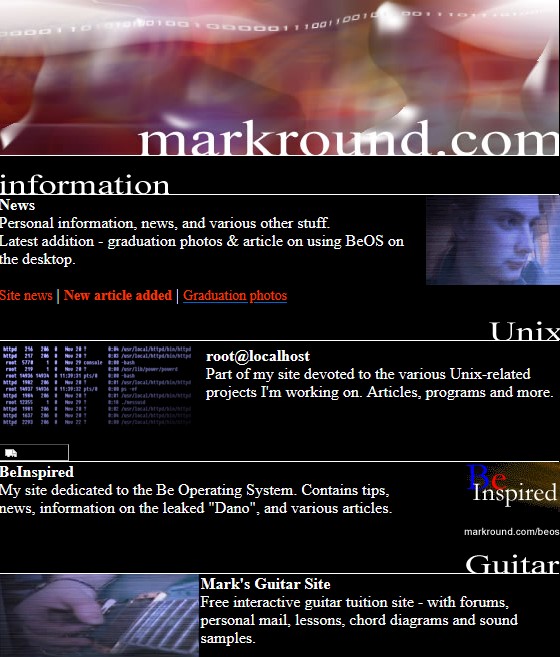 I built the whole thing using AOL Press and it was as clunky as you’d expect for the era! Unfortunately (or fortunately, depending on your point of view) no usable archives of this exist, the earliest nearly-complete captures I have of the site are when I registered markround.com and set up a PHP-Nuke (remember that?) based site on a shared-hosting LAMP stack.