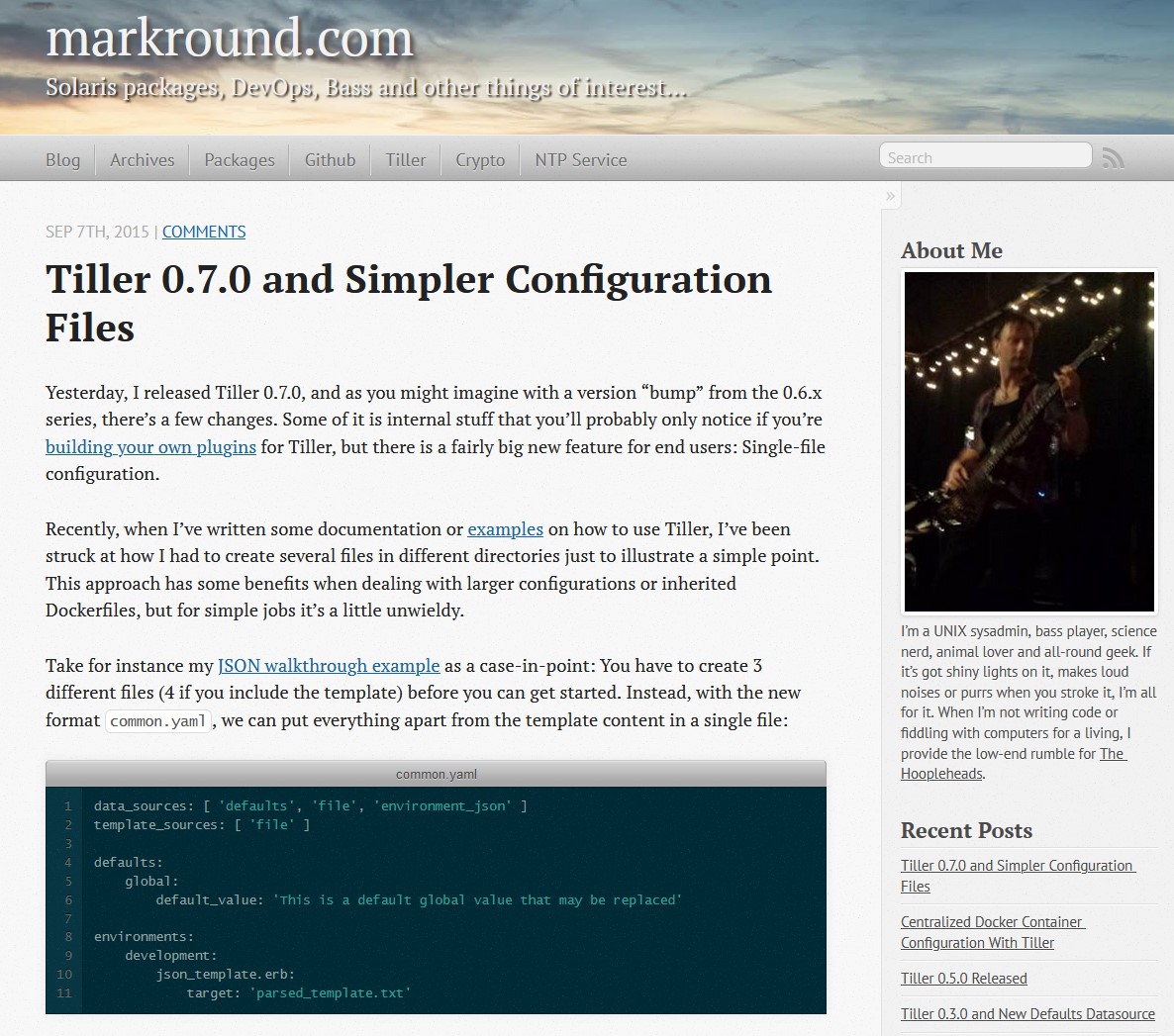 So I wrote Tiller. And that project really took off! It’s admittedly small fry in the terms of open source projects and is pretty much stalled at the moment but it’s still managed to (at the time of writing) hit 244,360 downloads from RubyGems, acquire 320 Github stars, have 11 pull requests from other developers merged, and over 2,000 lines of documentation written plus it’s pretty much all I blogged about then.