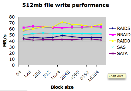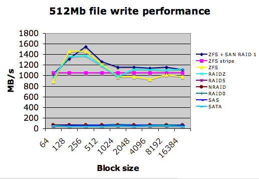 Some interesting results here, which I’ll skip over for the moment (like the Ultra20 beating the X4100 and SAN in read performance!) - the kicker happens when I added ZFS into the mix as an experiment. On average, I ended up seeing an average rate on the non-ZFS volumes depending on how they were configured, on average I was seeing 65MB/s write performance and around 450MB/s read on the SAN using a single drive LUN. This was faster if I used a stripe, slower if I used RAID 5, pretty much what you’d expect. Also everything seemed to get capped out at the theoretical maximum of 2x2Gb/s channels (around 512MB/s). So far, so normal… Here’s my results for write performance, for a basic comparison :