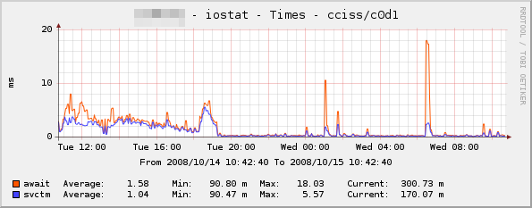 I’ve been looking for ages for a tool to parse the output from "iostat" on Linux, and graph it in Cacti. I found a few scripts and templates that did some of what I was looking for (disk I/O etc.), but nothing that gave me the full set of statistics such as queue length, utilisation, service time etc. I finally got round to writing my own set of templates and a data gathering script to provide this information, and it seems to work very well. So that others can benefit, I’ve posted the package archive and a brief description over on the Cacti forums (click Continue Reading for a download link to an updated version - the one on the Cacti forums has a bug so that it won’t work with all versions of sysstat). Below are a couple of sample graphs to give you an idea of what it can do - there’s also a few more samples posted in the Cacti forums thread :