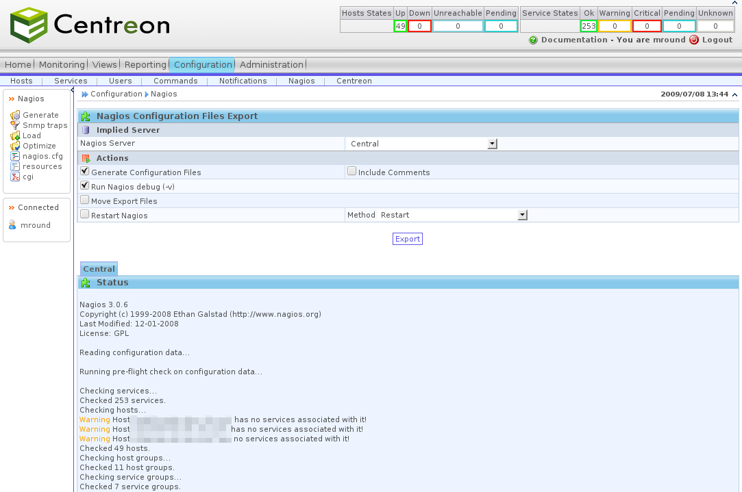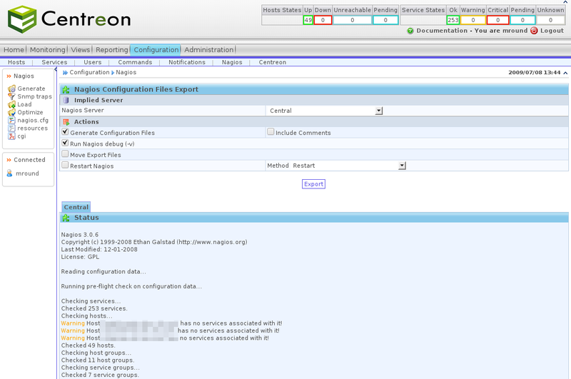 Of course, as it’s all ultimately using the text-based configuration files, you can always use your existing scripting or configuration management infrastructure to manage hosts, services and relationships as needed. After you have made your configuration changes, they are not immediately picked up by Nagios; you need to export the generated configuration which is done by navigating to the Configuration -> Nagios screen. By default, this will only test the configuration; once you’re happy with it, you can tick the "Move Export Files" and "Restart Nagios" boxes to make the generated configuration live and restart the Nagios process.