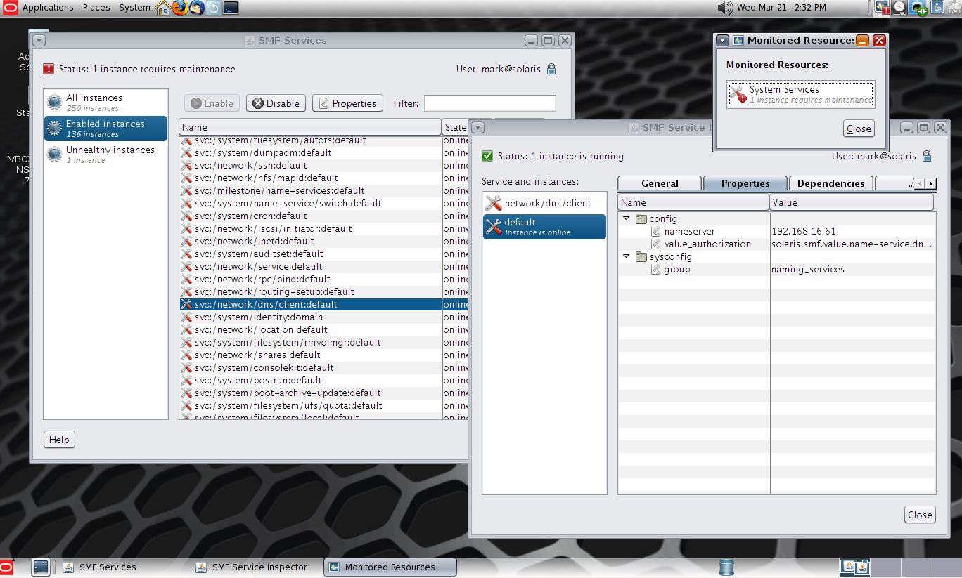 From a text-only install of Solaris 11, you can add the GNOME 2-based desktop environment using sudo pkg install solaris-desktop. There’s not much to say here really, if you’ve used GNOME 2.x, it won’t come as much of a shock to you. There are a couple of nice additions including a SMF applet and related control panel. There’s also a GUI package manager, firewall manager and automated snapshot system called Time Slider integrated into Nautilus - think of Apple’s Time Machine, but built on ZFS.