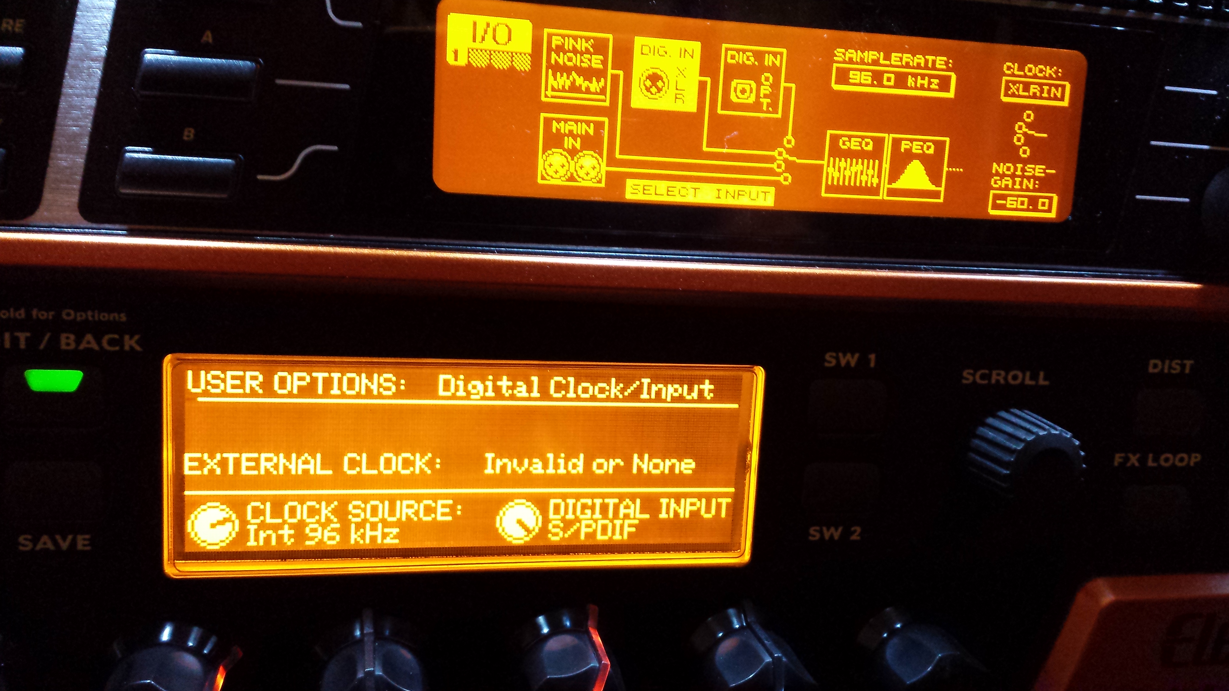 - On the DEQ2496, switched the input on my presets to digital in, and checked they had locked onto the 96Khz signal: