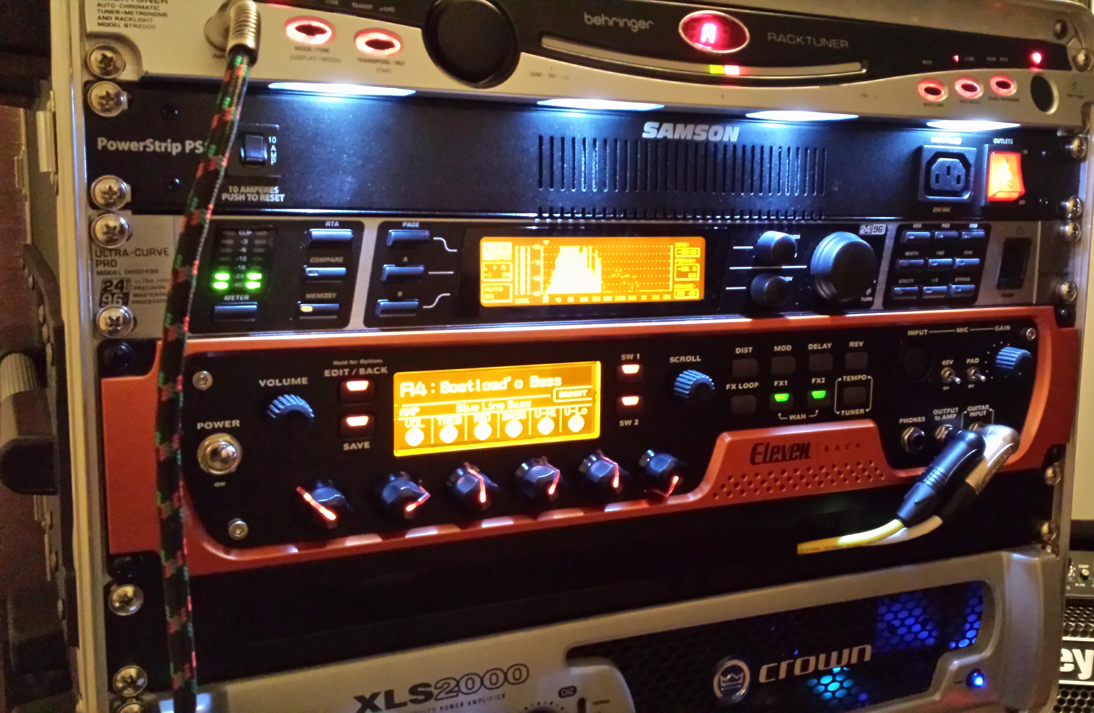 I had just bought an Avid Eleven Rack modeller to replace a series of utterly unreliable Behringer V-Amps (that’s a story for another day!). It sounded great when hooked up to my computer as a recording device, but I had a major issue when using it through my power amplifier for live use. I was running the XLR balanced outputs to a Behringer DEQ2496 unit for final EQ tweaks[1], the XLR outputs from that to a Crown "DriveCore" XLS 2000 power amp, and then finally into my two cabs.