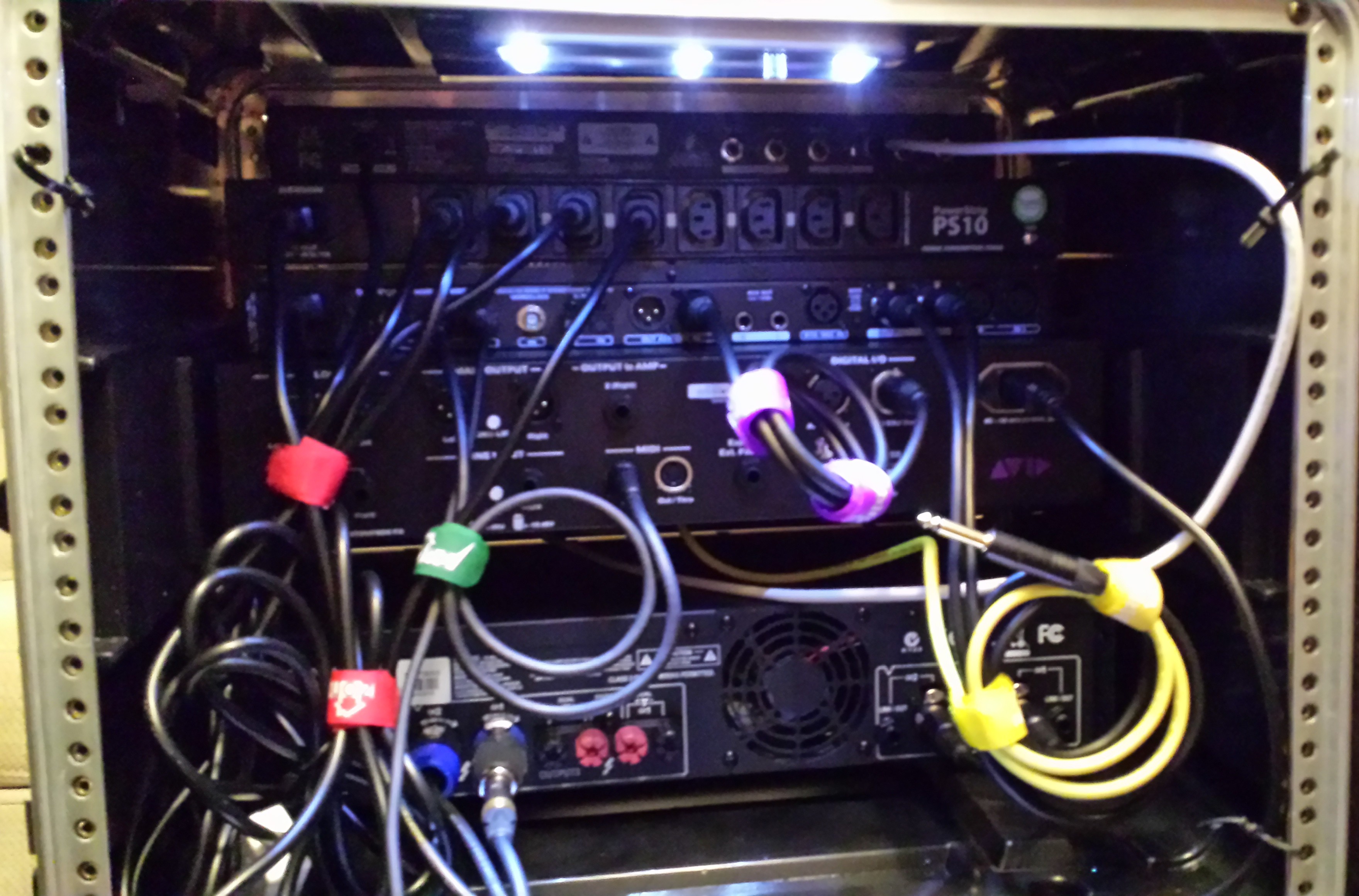 In that picture, red bundled cables are power from the Samson power conditioner, green are MIDI cables, yellow is the XLR output to the power amp and purple is the digital AES signal. The stray 1/4" TRS jack hanging out the yellow bundle is there if I ever want to plug the front "Output to Amp" socket into my practice Laney combo.