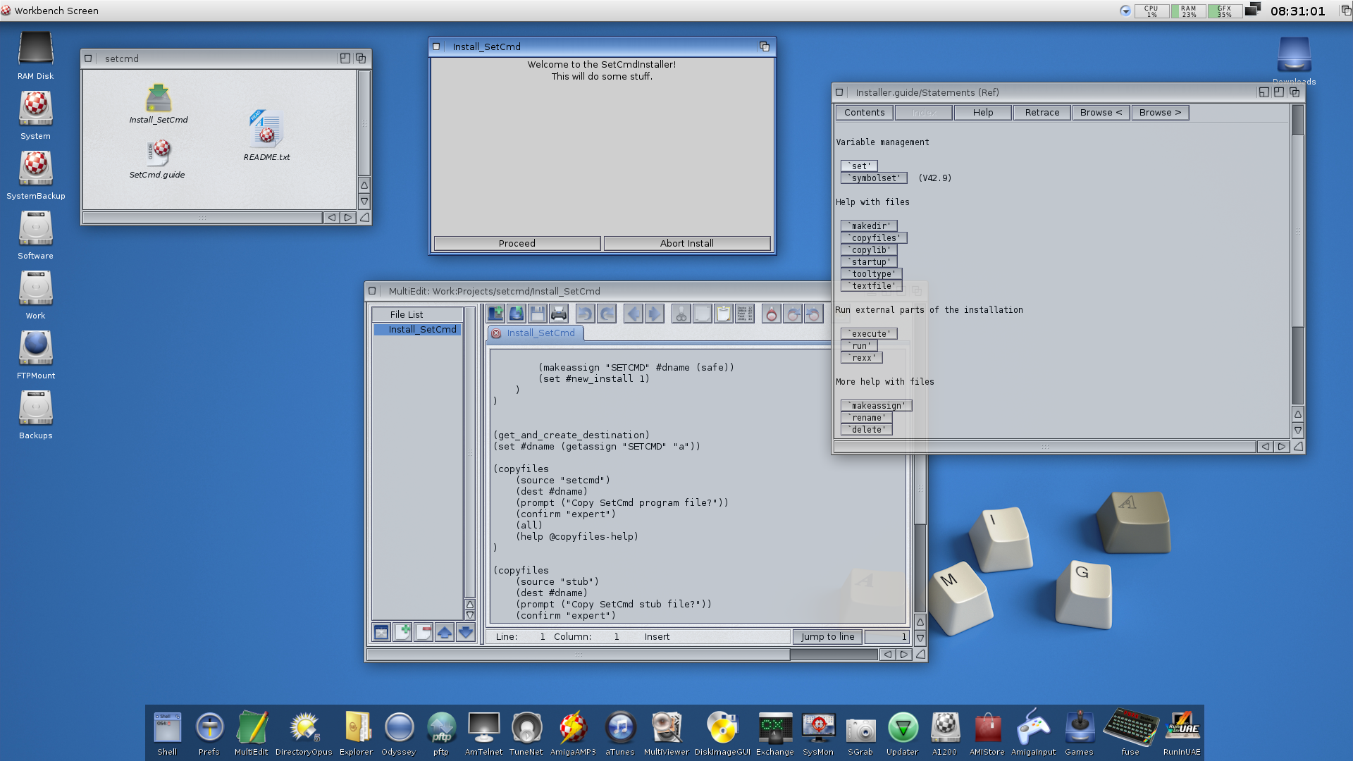 I initially found it very difficult to find any definitive guide for this language as nothing was showing up on web searches. After struggling through with trial and error and only example scripts to help, I remembered that this is Amiga-land so there’s probably documentation in a native format. And sure enough, searching Aminet brought me to the Installer dev package. It dates from around 1996 which is shortly before I first left the Amiga scene but still seems to be a relevant source of information. The supplied Installer.guide is a great resource, and you can see it open below along with my Installer work in progress: