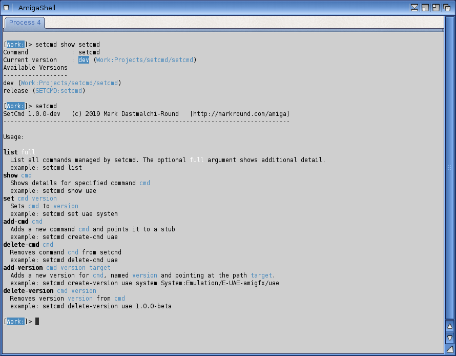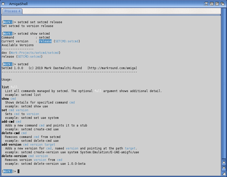 Note that the version number changes in the header of the command, and setcmd show setcmd shows the versions changing. Also note the liberal use of AmigaDOS Assigns - one of my favourite features of this OS, and one that I really miss on other systems. VMS had something similar with System Logicals, and of course Unix systems have symlinks but they don’t work in the same way, and aren’t nearly as useful or efficient.