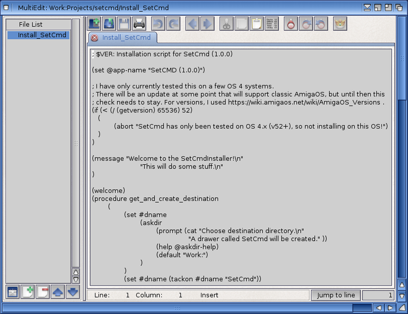 For my current stage of development though, it was overkill for editing and managing a shell-script based project. The syntax highlighting for AmigaDOS scripts was also a little basic, it only really seems to differentiate between comments, strings, and “everything else”. I’m still probably going to use it a lot later on when I get back into C development, but for now I needed something with more features than “MultiEdit” but not quite as advanced as an IDE.