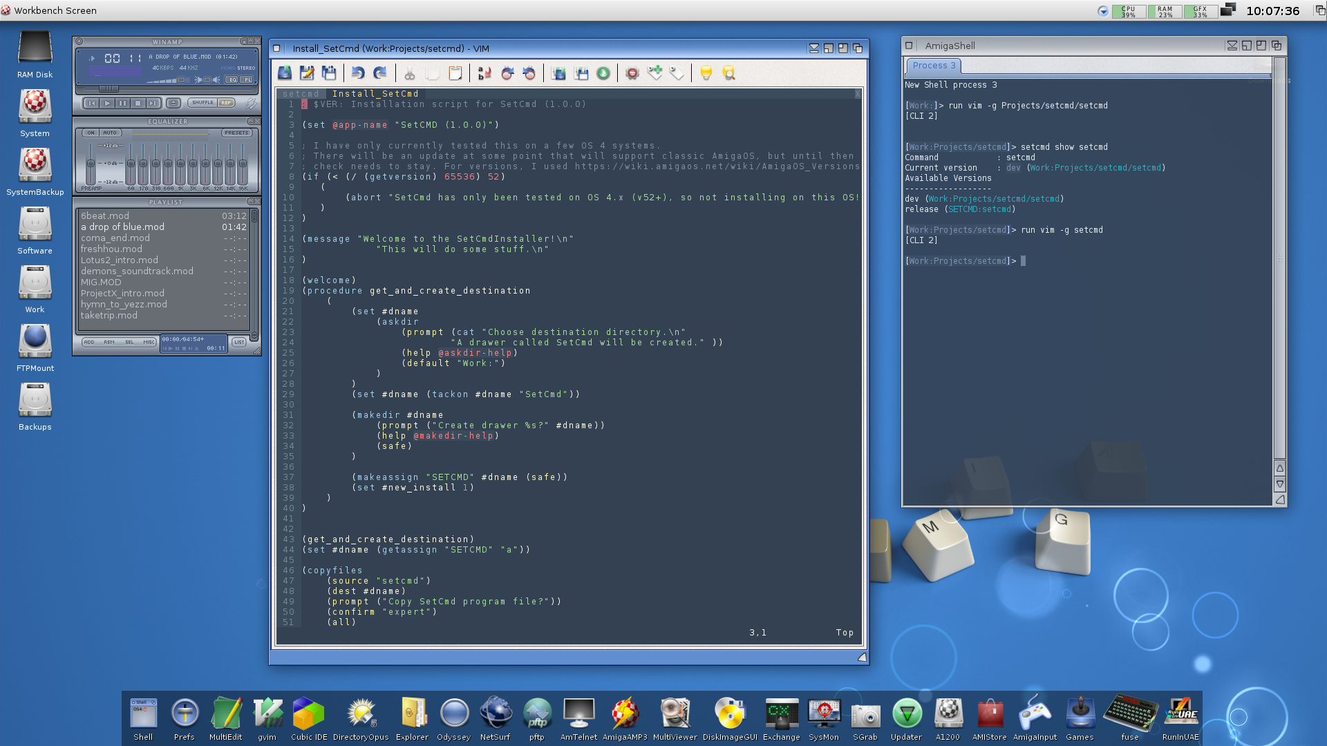 I have Vim running in graphical mode with a couple of tabs open, an AmigaShell session for testing and debugging and of course, AmigaAmp playing some classic MODs in the background. Bonus points to anyone who recognises where the currently playing track comes from ;)