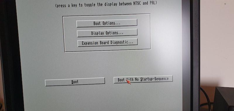 I was again met by a black screen when booting, but I could get into the A1200’s Early Startup menu by holding down both mouse buttons on boot. From there I could boot without a startup-sequence (Unix users: you can think of this like booting straight into /bin/sh).