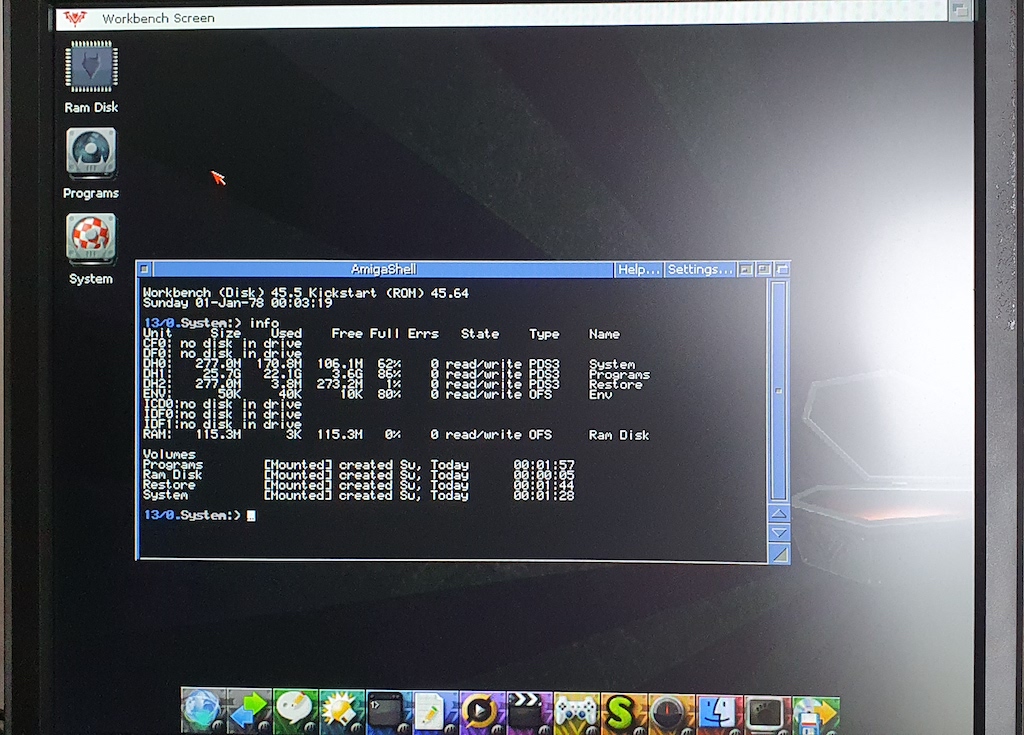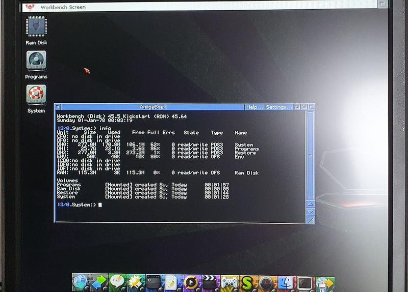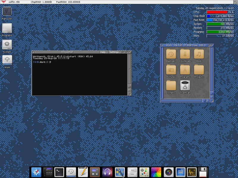 I’d fitted a 32GB SD Card to the Vampire following the wiki instructions, which I formatted with PFS3 and was using as my new Work: volume. This means I can easily remove it and back it up using dd or similar, and I also keep all my customisations, downloads and projects on a separate volume to the system drive. I have a backup/restore script so if needed, I can just re-flash the system drive, mount the SD Card, run the script and be back up and running. This is particularly useful because there isn’t really a method of updating CoffinOS other than writing a new image over your CF Card.