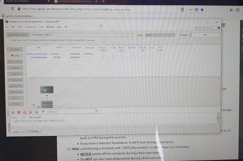 Without being able to get a core onto the system - and even then, I’m not sure I would have trusted it to remain stable while flashing - I had to resort to using the USB Blaster to flash the board from a Windows laptop. I’m really glad I purchased it now, and would definitely advise anyone buying a Vampire card to also invest in one.