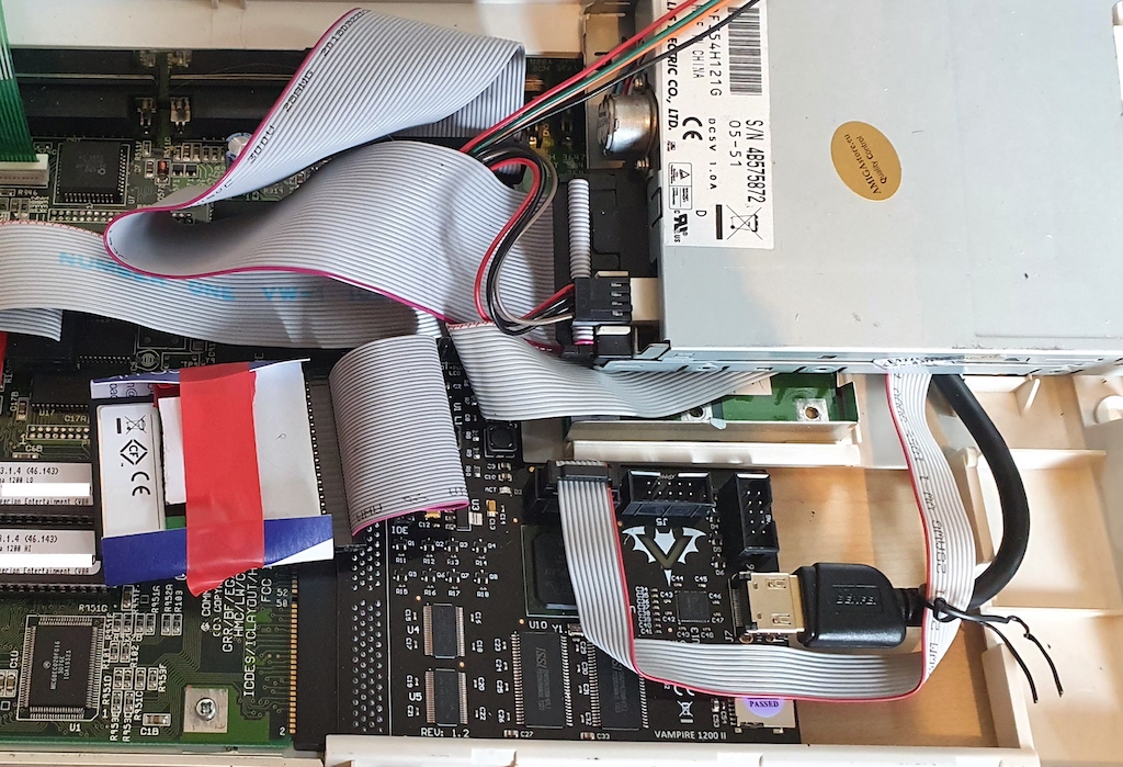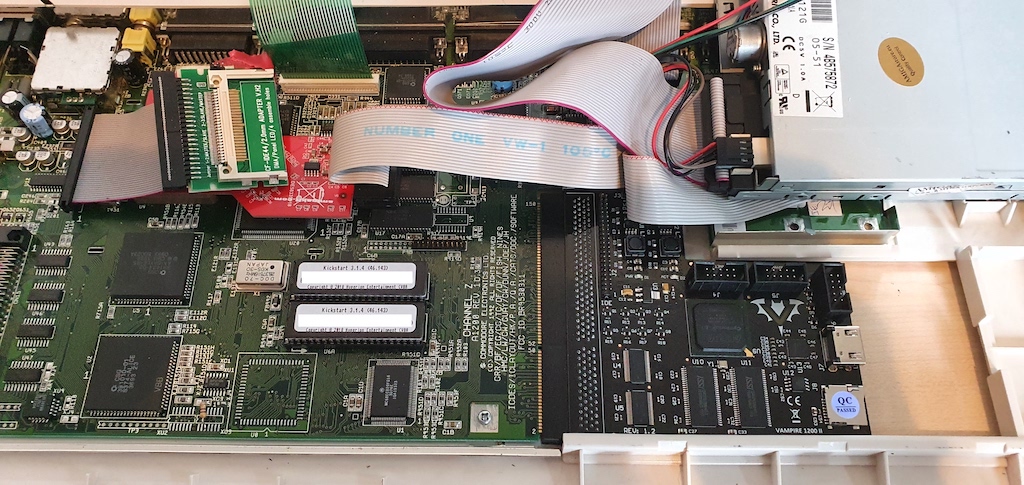 I then had to move the CF card back over to the Amiga’s internal IDE port because the 2.12 core disables the use of the Vampire’s onboard IDE, you can just make out below that it’s moved back over to the original position on the left of the A1200 motherboard: