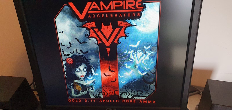 The Vampire contains a licensed Kickstart ROM (with customised version messages), so I could in theory remove the 3.1.4 chips. Switching over to the the Vampire HDMI output, I saw the splash screen for core version 2.11: