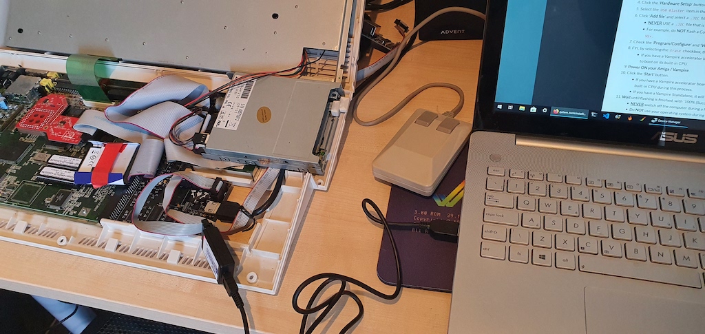 Here’s the blaster hooked up to my Windows laptop and connected to the Vampire through the JTAG port. Fortunately all cables came with keys and notches to make sure everything is aligned in the correct direction, and it was all very easy to set up: