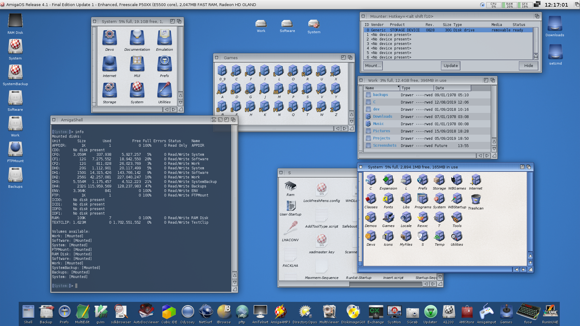 To move all my data over from my previous OS 3.9-based system drive, I attached the CF card to my AmigaOne X5000. As I discovered when I first got that system, OS 4 can mount and read the drives from my A1200, so I used that to copy a few packages, license keys and configuration over to the Vampire system via the network.