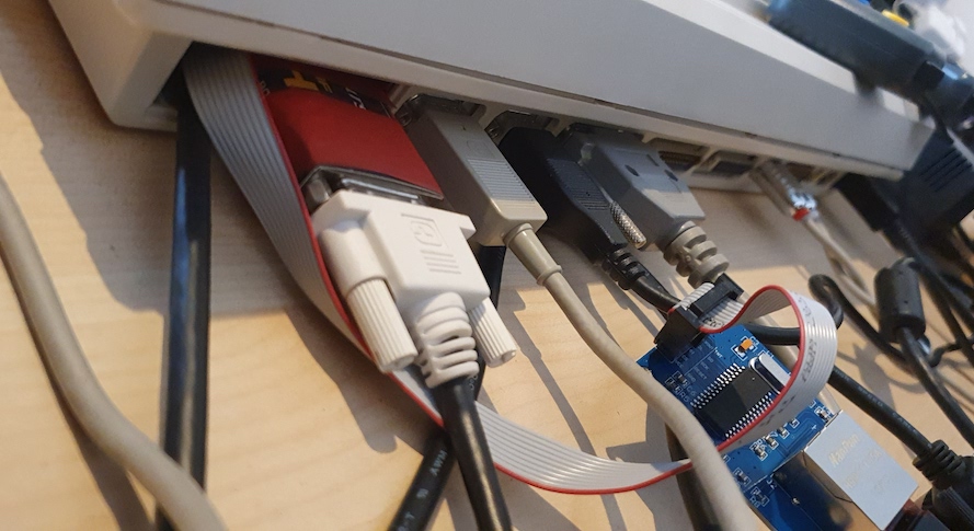 I then wanted to connect my new Vampire’d system to my home network so I could transfer data to and from it and properly “move in”. I’d purchased the ethernet module which attaches to the Vampire card through a thin ribbon cable.